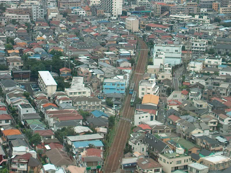 下高井戸でYAKUMO氏と待ち合わせをし、一日乗車券を買い求めました。促されるまま最初に行ったのは、三軒茶屋駅前のキャロットタワーという高層ビル。最上階の展望台へは無料で上がれます。この展望台は、東半分がレストラン、西半分がラウンジとなっているんですが、問題の世田谷線はちょうど西側にあります。まるで世田谷線を撮影するためにあるかのよう…。ここからだとまるで空中写真のような雰囲気の写真も撮れます。同様のアングルの写真が雑誌に掲載されているのを見たことがあったりして、みんな考えることは同じなのかな、とも思ったりします。でもこの日の天気は一触即発状態。雑誌に掲載の写真は快晴だったと思うので、同じ場所でも写真の印象は大きく変わりそう。光量不足のため、銀塩で撮影しているYAKUMO氏は大変そうでした。