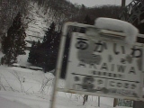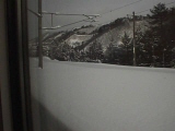 福島で新庄行きの「つばさ」と仙台行きの「やまびこ」が切り離されます。かつて、列車の切り離しや連結は長時間を要したものですが、今は気づかないうちに作業が終了してすぐに発車していました。新幹線の高架から地面の高さにある在来線まで降りていきます。線路際に家が建ち並んでいたりして、新幹線との違いが明らかです。速度も最高で130km/hということで、在来線としては高速な部類と思いますが、福島付近では大したスピードではありません。それもそのはずで、ここは峠道の入口であるためだったのです。写真でもかなり雪が深いことが分かります。