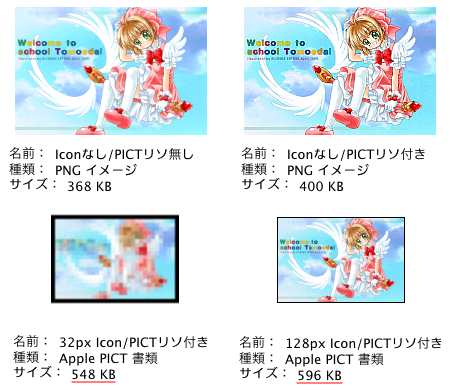 つまり、せっかく PICT リソースにプレビューを持っていても利用しないンだ。縮小サムネイルなアイコンを 32px の大きさでしか作ってなかったら、それが 128px に拡大されて、ガクガクの絵が出るとゆー。なんですかこれわ。