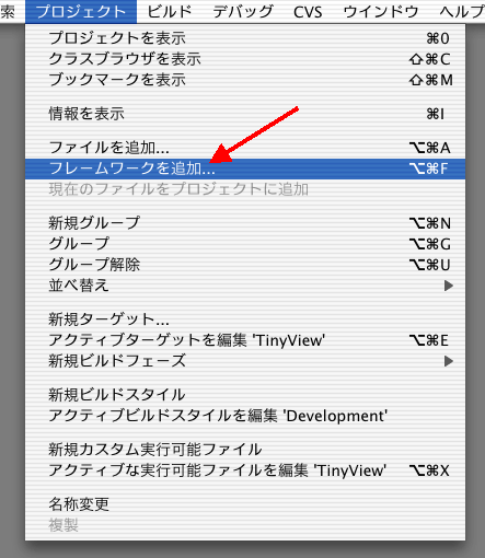 これでコンパイルは出来るようになりましたが、まだリンクエラーが出ます。次の様に操作して、フレームワークを追加してください。