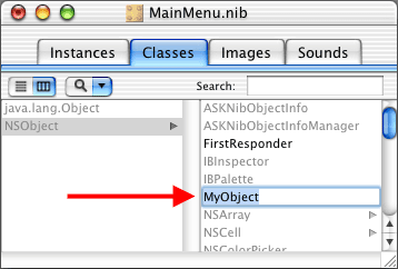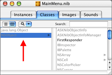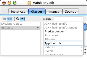 ここに表示されているMainMenuの中身を編集しますと、メニューバーの中を変更できるのですが、今回はこれはほっておいて、nibファイルウィンドウのClassesタブを選んで下さい。するとクラスの一覧がカラムビューで表示されます(fig.03)。