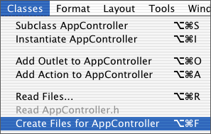 変更しましたら、AppControllerが選択されていることを確認してから、ClassesメニューのCreate Files for AppControllerを選んで下さい(fig.09)。