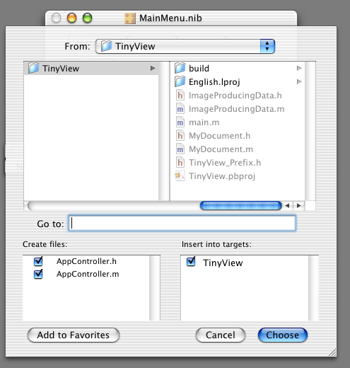 Create filesは生成するファイル、Insert into targetsはそれを加えるプロジェクトです。Chooseボタンを押して下さい。すると自動的にProjectBuilderに操作が移ります。プロジェクトウィンドウを見て下さい。AppController.hとAppController.mが加わっているはずです(fig.11)。