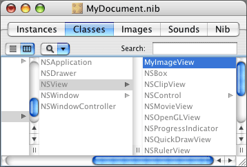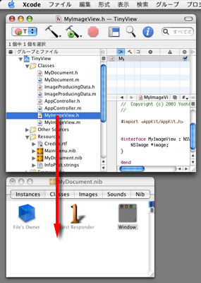 これでMyImageViewクラスの実装は終わりましたが、これをMyDocument.nibに反映させなければなりません。Resourcesの中のMyDocument.nibをダブルクリックして、InterfaceBuilderで開いて下さい。開いたらXcode(もしくはProject Builder)に一度戻って、MyImageView.hをInterfaceBuilderのnibファイルウィンドウにドラッグ&ドロップして下さい(fig.01)。