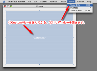 MyImageViewクラスが使えるようになったら、これをCustomViewに反映させます。デザインウィンドウでCustomViewを選んで下さい。選んだら、「Tools」メニューから「Show Info」を選び、Infoウィンドウを表示させます(fig.04)。