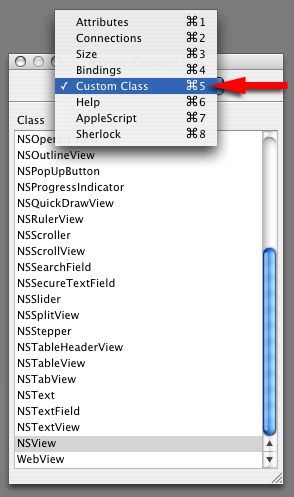 この場合は、あらかじめnibファイルウィンドウを、Classesタブを選んで、クラスの表示に切り替えておく必要があります。