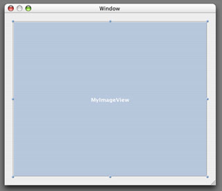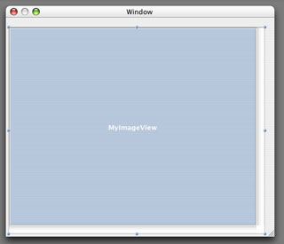 それでは、いつもの様にTinyView.pbproj(もしくはTinyView.xcode)を開いて下さい。そして、MyDocument.nibをダブルクリックしてInterface Builderで開いて下さい。開いたら、デザインウィンドウでMyImageViewクラスのインスタンスを選択して下さい(fig.01)。
