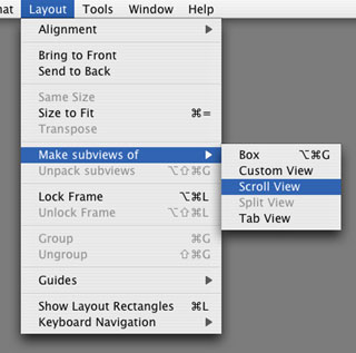 そして、「Layout」メニューから「Make subviews of」を選び、表示されたサブメニューから「Scroll View」を選んで下さい(fig.02)。