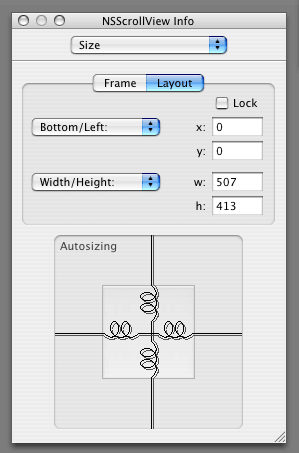 これで隙間は無くなりました。ですが、このままではウィンドウをリサイズした時にそれについてきてくれません。この指定を行うために、NSScrollViewクラスのインスタンスのinfoウィンドウを開いてください。開いたらポップアップメニューでSizeに切り替え、Autosizingの指定を行って下さい(fig.06)。
