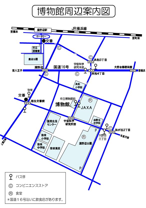 ※各回入れ替え制です。 交通案内 ![]() 国道16号「共和4丁目」交差点を西へ500m 無料駐車場95台(障害者用4台分含む) 大型バス4台可(無料※) ※大型バス、マイクロバスでお越しになる場合には、必ず事前予約をお願いします。 ※大型バス用駐車場は、当館の利用者しか利用できませんのでご了承ください。