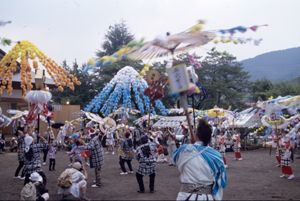 ここでは細かいことには触れられませんが、昔は境内の祠をお祀りするのは精進衆の仕事だったと言われており、例えば鳥居や御供岩、社殿などへ注連縄を張る作業は、今でも精進衆のみで行って他の氏子総代の人たちは手出しをしません。また、宵宮(祭礼前日の夜)に行われるいくつかの祭祀の準備や実施、神輿に随行する者たちが持つ祭具を作る、神輿に御霊を移す際に神主の補助をする、神輿に付いて歩いてお旅所でお神酒を供えるなど、精進衆は祭礼の諸準備から実施に至るまでのさまざまな仕事を担っています。与瀬神社の祭礼にあたって、神主ではなく神社と関わりのあるとされている精進衆が重要な役割を果たすなど、比較的古い祭祀のあり方を示すものとして注目されます。(民俗担当 加藤隆志)