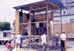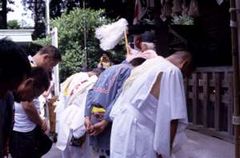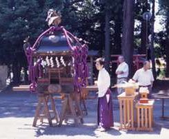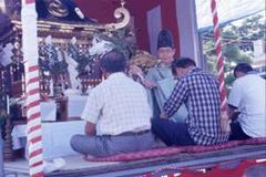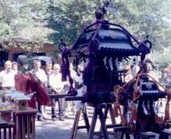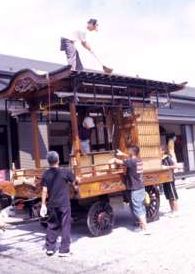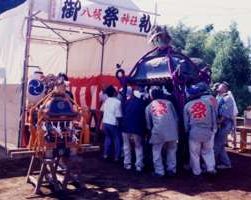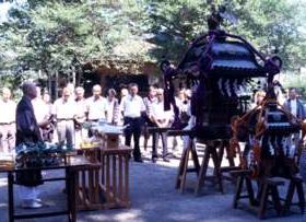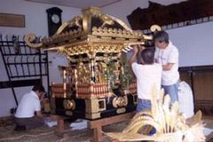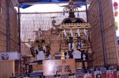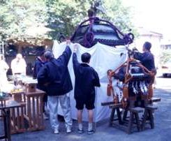| 本町自治会のシメ縄張りで取り上げたように、祭りの準備は7月1日から行われる所が多く、神輿の渡御(とぎょ)と山車の巡行をする本宮(2011年は24日[日])の前日の宵宮(2011年は23日[土])には、自治会ごとにお仮屋を設置して神輿を安置します。 それぞれのお仮屋に亀が池八幡宮の神官が回って神輿のお祓いとミタマ入れをしていきますが、本町自治会と五部会(元町・田中・本久自治会の範囲)では、宵宮の前日の金曜日に別にミタマ入れが行われています。 本町ではこの日ではなく事前にシメ縄を張った横にお仮屋を作っておき、当日は神輿や山車の準備をして神官が来るのを待ちます。午後4時から自治会長や役員が並ぶ中で神輿のミタマ入れが厳かに行われ、これ以降は神様が神輿に宿っているため、祭りが終了してミタマが抜かれるまではたとえ深夜であっても、誰かが神輿のそばにいて番をします。また、お仮屋の所は場所が狭いこともあり、ミタマ入れが終わると本町の山車は少し離れた場所に移動していき、ここで宵宮を待つことになります。そして、宵宮の夕方から夜にかけて、上溝の駅前通りなどを歩行者天国にして山車の巡行が行われ、各地区の山車が集まって来てにぎやかにお囃子が奏でられます。なお、本町自治会の山車は明治40年(1907)に八王子市横山町から譲り受けたものともいわれ、元は二階部分があり、その上に豪華な天照大神の人形が乗った人形山車であったことが大正初期頃の写真によって確認できます(『相模原市史民俗編』334頁)。