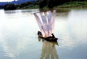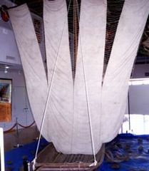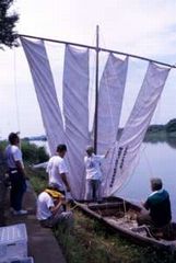 今年(2011)も8月7日(日)に磯部頭首工の上流付近で実演会が行われ、多くの見学者が訪れました。船の走行には4〜5mほどの風速が最適とされていますが、今回は吹く風が今一つ弱かったものの、それでも帆に風を一杯に受けて上流に向けて進む興味深い姿を見ることができました。