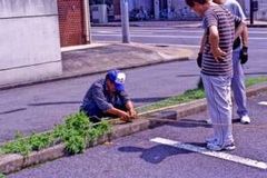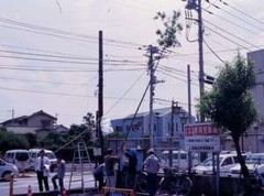 | 毎年、7月下旬の土日に行われている「上溝夏祭り」は県北最大の夏祭りの一つであり、30〜40万人もの人出を数える相模原市を代表する観光行事です。また、江戸時代後期の神輿が何基か残されていることから、この頃にはすでに、祭りがある程度盛大に行われていたと考えられています。古くは祭りのことをオテンノウサマといい、祭り自体や神輿そのものをオテンノウサマと呼ぶことが今でもありますが、現在は相模原市の祭りとして「上溝夏祭り」が正式の名称となっています。今年(2011年)の上溝夏祭りは7月23日(土)と24日(日)に、例年のようににぎやかに実施されました。 神輿の渡御(とぎょ)や山車の巡行が行われる本番を前にして、上溝の多くの自治会では7月1日から祭りの準備に取り掛かります。 まず朝には長い竹を伐り出し、自治会館の前や自治会の境などにシメ縄を張った二本の竹を立てます。これを「シメ張り」といい、道切りとして集落に悪い病気が入ってこないように立てるとされています。ここに掲げた写真は今年の本町自治会のシメ張りの様子で、長さは約7m、8人掛かりで1時間30分ほどで完成しました。かつては集落境に、隣りの集落同士が競うようにシメ張りをしたものの今では少なくなり、本町では上溝商店街の駐車場の所(この奥に自治会館や本町でお祀りしている不動堂と大鷲神社などがあります)の1か所だけになったとのことです。