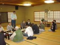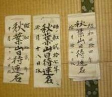 | 私たちが日々の生活をしていくに当たってはいろいろな心配事があり、火災もそのうちの一つです。一度火事になれば、自分の家ばかりか近所が燃えてしまうことも起こりかねません。こうした火事にならないように祈る神仏や行事が市内各所で見られ、現在でも行われている地区があります。今回は緑区相原に残る二つの行事を紹介します。 相原・森下の大門講中は「祭り・行事を訪ねて(10)」で榛名講を紹介した地区で、春の雹除け(ひょうよけ)としての榛名講に対して秋には秋葉講が行われています。秋葉神社は静岡県の天竜川上流にあるものを本社とし、火災除けの神として市内でも広く祀られてきました。 今年(2011年)の大門地区の秋葉講は、11月13日(日)の午後7時から近所の料理屋を会場に会費制で行われました。正面には秋葉神社の掛け軸と、隣りには地区内にある華厳院(けぞういん)から出されたお札が竹に挟んで置かれています。当日の参加者は11名の方で、まず春からの自治会や神社に関わる報告などがあり、その後は宴席に移りました。華厳院のお札は、秋葉講が終わってから後で述べる灯籠の所に持っていって立てます。かつての大門地区の秋葉講は、保管されている帳面によると10月17日に3軒ある当番のうちの1軒に集まり、各家から白米と菜代のお金を集めて行われていたようです。