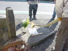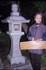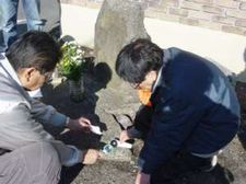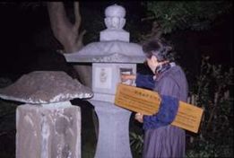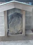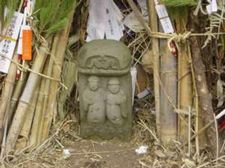 | 町田駅から境川を左手に見ながら南に向かって進むと、10分ほどで金山神社に到着します。金山神社は上鶴間・谷口地区の中でも第一町内(竹之内講中)の鎮守で、境内には八坂神社や第六天のお宮なども祀られています。そして、この神社の一角に、新たな道祖神がお目見えすることとなりました。 石造の道祖神は市内各地で確認され、この地のものは一つの石に二神が彫られた「双体道祖神」で、かつて調査された際の銘文からは寛政11年(1799)に造られたものであることが分かります。しかし、今ではこの像の傷みがひどく、二神のお姿もはっきりとしない状況になってしまいました。そこで、この機会に新しい道祖神を造立しようという機運が盛り上がり、今年(2011年)4月29日に神官や地域の代表の人々の立会いの下に無事にお披露目(遷座式)が行われたのです。
