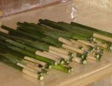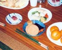 | 南区当麻の芹沢集落は、時宗の開祖である一遍上人ゆかりの無量光寺の東側に位置し、やはり一遍によって建立されたと伝える三嶋神社を祀っています。そして、かつては11月15日に、現在ではその付近の土曜日に行われている三島神社の祭礼の「ナマスマチ」は、これから紹介するように非常に特徴ある内容が現在でも見られます。 この祭礼では、大根を薄く削り、酢と砂糖で味付けをしたナマスが参加者に出されることからナマスマチと呼ばれており、ナマスの上には、これも酢と砂糖を効かせたナマスノコと呼ぶマグロのブツを二切れくらい乗せます。さらに、ナマスとともに一人ひとりに付くのが、鯖と大根・里芋を醤油と砂糖の味付けで煮たもので、これらを一皿に盛り合わせます。氏子がみな農家だった時代には大根とともに里芋も5個ずつ持ち寄ることになっていたと言います。こうした料理を食べる箸は、祭礼当日に神社裏手の細い篠竹を伐り出して作ります。ナマスなどは参列者が食べるだけで特に神前に供えたりすることはなく、かつては料理の準備など全部男によって担われていましたが、今では女性も加わって行われています。