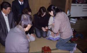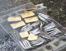 実は、何の変哲もないように思えるこの行事の中で特徴的なのは、オタキアゲと称して各家の正月のお飾りを燃やしていることで、境内の一角に集められた正月飾りを焚き火にくべてその上に網を置き、赤飯やお神酒とともに稲荷社にお供えされた油揚げやめざしをあぶって食べながら話をします。「祭り・行事を訪ねて」の欄でもたびたび紹介しているように、市内では周辺地域を含めて、正月飾りは正月14日頃を中心に実施されるどんど焼き(団子焼き・セイトバライ)で処理するのが当たり前で、その火で団子を焼いて食べることは現在でも広く行われています。ところが新屋敷では昔からどんど焼きがなく、正月飾りは初午の際に燃やしていて、かつて子どもたちは隣接する堀の内や松原集落のどんど焼き(日之下地蔵横、大正坂下の十字路)に団子を焼きに行き、その際にはよそ者が来たというような目で見られたと言います。