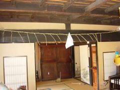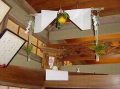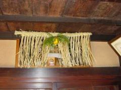 まず最初に作ったのが神棚用のものです。榊に藁(わら)で編んだ飾りを巻きつけ、真ん中にはユズリハとウラジロ・ダイダイ、裏側には折った半紙を取り付けます。ユズリハなどは買い、縛るのには水引を使います。神棚の中には大神宮・年神・水神などのお札があり、新しいものを入れます。通常は新しいお札を飾ると古いものは取り出して14日などの団子焼きで燃やしてしまうのに対し、当家では古いものも片付けないで溜めておきます。次に、家の中の十畳間の神棚に近い方の鴨居に付ける長い注連縄(しめなわ)を作ります。これは藁で縄をなってつなげて下のハカマの部分を出したものです。藁は上側の縄にするところだけを叩き、「ゾベになえ」と言って荒っぽく、普段とは違って左縄になっていきます。向かって左から七五三にハカマを出し、七と五の間に半紙を折ったものを差し込みます。