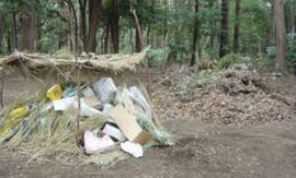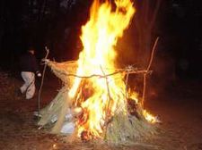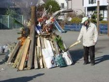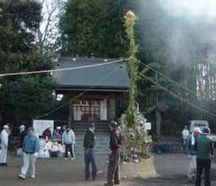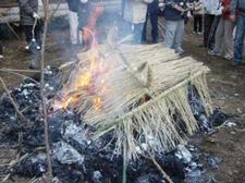 | 前回の「祭り・行事を訪ねて(25)」で紹介した原当麻地区と同様に、「道祖神の小屋」を作っているところに古淵地区があります。古淵の団子焼きは、地域の鎮守である鹿島神社境内裏手を会場として、例年、曜日に関係なく14日に点火となっており、自治会などとは関係なく古くから住んでいる人たちを中心に行われています。 準備は、当日の午後に、神社役員が木で枠組みを立てて藁で小屋状のものを作り、7日を過ぎると各家から神社の境内の一角に出されるお飾りやお札などを内側に詰めていきます。この藁の小屋は「道祖神のお宮」などと言われますが、特に中に道祖神があるわけではなく、そもそもこの地区には道祖神碑は見あたりません。また、小屋の隣りには、毎年その場所を使っている少しくぼんだ所があり、ここにはたくさんの枯れ枝などの木の枝を積み上げるほか、お飾りなどが置かれることもあります(こちらのものは特に名称はありません)。