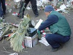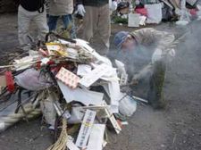 準備では、まず三つ又の枝作りから始まり、燃やすお飾りを積み上げて円錐形に作ることや集まってくる人々に配る団子を作ることと並んで、いつも置かれている路傍の祠から道祖神の石碑を運んできて燃やすものの前に数メートル離して置き、両者を注連縄(しめなわ)で結んでこれにも各家から出されたお飾りを下げていきます。