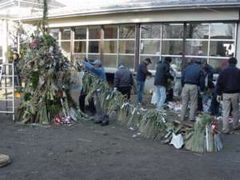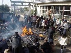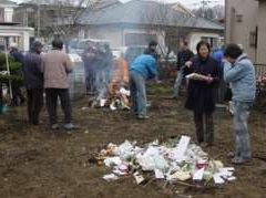 | 今年の団子焼き(どんど焼き)では、「祭り・行事を訪ねて(24)・(25)」で記した町田市木曽町境川や南区当麻の原当麻地区のほかにもいくつかの場所を訪れることができました。今回は、その中から道祖神を燃やしたり小屋を作ることと関連するいくつかの地区を取り上げることにします。 南区上鶴間本町の金山神社は「祭り・行事を訪ねて(14)」で紹介した新しい道祖神碑を建立した地区です。新しいものを作ったのは、以前よりあった道祖神碑を、境川地区のようにかつて火の中に投じていて傷みがひどくなったためで、現在では実際に燃やすことはなく、点火前に持ち出して前面に置くだけになっています。この地区で注目されるのは、点火する火種を神社の外側の辻になっている所で付けることで、これは古くはこの場所に道祖神碑があってその前で団子焼きをしていた名残りであり、新旧の道祖神ができて別の位置に移されても火だけは元あった所から持ってきていることが分かります。今年も例年通り、14日(土)の昼過ぎに点火してすぐに団子が焼けるように準備しておき、午後3時前には団子焼きが始まりました。