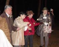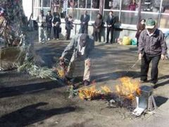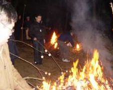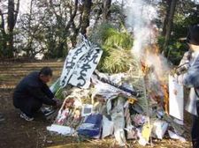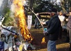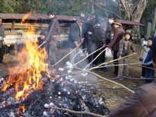点火は14日の午前8時で、市内でも相模川に沿った南部地域や津久井地域の一部などでは、昔から朝方に火を付けたとする地区があり、原当麻もこうした所になります。実は今から10年ほど前の2004年にもこの地区に展示の関係で訪れたことがあり、その際には朝7時に点火で、かつてはさらに前の6時だったということでした。こんなに早くては子どもが団子を焼きに来られないということで、今回は8時に点火ということとしたそうです。点火すると木立の中でかなり火が燃え上がり、そのうち親子連れを中心に、地区の人々が三つ又の枝に団子を付けたものを持って集まってきて団子を焼き始めます。中には「奉納道祖神」と書いた書初めを枝に付けている人もいて、書初めを火に近づけるとあっという間に半紙が燃え上がります。焼いた団子を食べると風邪をひかないとされるとともに、書初めが高く上がると字が上達すると言われています。