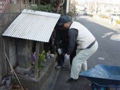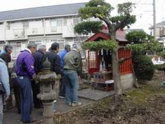 | 市内には集落の神社として、また、一族や個人の家々の神として非常に多くのお稲荷(いなり)さんが祀られており、今回紹介する南区下溝の新屋敷(アラヤシキ)地区にも稲荷社があります。元々はこの稲荷社の敷地は地区内の旧家である福田家の畑の一角にあり、福田家とともにやはり旧家の矢野家一族の守り神でしたが、後には稲荷社の回りも開発されるなど家数も増えたこともあって今では地区全体の神になっています。 各地の稲荷社のお祭りが行われるのが、2月に入って最初の午(ウマ)の日である初午です。新屋敷の稲荷社では、今年(2012年)は初午が3日で金曜日となるため、直後の日曜日である5日の午前中に稲荷講が行われました。福田家や矢野家で祀っていた頃には、初午に各家の中から宿を決めて集まっていたのに対し、現在では稲荷講世話人会と自治会で管理しており、通常の稲荷社の清掃などは平成16年に発足した世話人会が当たり、初午の際の稲荷講は自治会の中の組が毎年当番となって実施する(今年は7組)という形を採っています。 当日は、午前8時30分に7組の方々が稲荷社に集合してテーブルや椅子を出したり、稲荷社の幟旗(のぼりばた)を設置するなどの準備を行いました。ちなみに今の幟旗は二代目で、古い初代のものは京都の伏見稲荷から請けてきたとのことです。また、焚き火を燃やし、9時に稲荷社に全員でお参りして稲荷講が始まりました。ただし、稲荷講といっても特別に改まって何かをするようなことはなく、集まった人々が酒や茶を飲みながら1〜2時間の間歓談するだけで、お参りに来た子どもたちにはお菓子などを配ります。その後、焚き火が消える頃に後片付けをして、掛かった経費の精算をして終了となります。