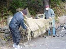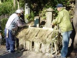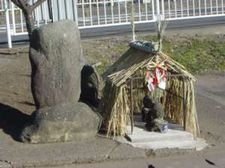 | 前回の「祭り・行事を訪ねて(24)」で紹介した道祖神石碑を焼くことと並んで、どんど焼き行事の中で現在でも行われている特徴的なものとして「道祖神の小屋」を作ることがあります。これは道祖神やその他の石仏を覆ったり、その近くに藁で小屋状のものを作ることで、かつて作ったとする伝承は各地にありますが今でも田名や当麻の一部の集落や古淵などでは見ることができます。ここでは、今年(2012年)の当麻・原当麻地区の状況を紹介します。