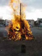 | 今年(2012年)も正月8日から15日にかけて、団子焼き(どんど焼き)の行事が賑やかに行われ、私もできるだけ各地を回り、多くの行事の様子を見せていただきました。その中には大変特徴的なことを行っている地区がありますので、この欄でいくつかの地区の状況を報告したいと思います。 かつてのこの行事では、各家の正月飾りとともに地域で祀る道祖神の石碑を実際に燃やしてしまったとの伝承が残されており、「祭り・行事を訪ねて(14)」でも少し触れましたが、市内でもいくつかの地区でこうした話を聞くことができます。これは現在ではほとんど無くなっていますが、南区古淵地区の境川を挟んだすぐ対岸の町田市木曽町の境川地区では現在でも道祖神の石碑を燃やしています。ここには正面に「道祖神」と刻まれ、文化5年(1808)7月の銘がある石碑「セイノカミと呼ばれていました」が祀られていて、近年までこの石を燃やしていました。しかし、毎年のことなので傷みがひどく、現在は平成20年(2008)に新しく造られたものを燃やしており、以前のものはどんど焼きを行う八坂神社の境内に祀られています。
