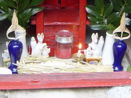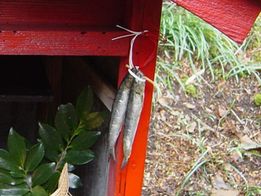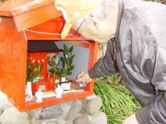 | 前回の「祭り・行事を訪ねて(28)」では、地域全体で祀られている稲荷社での初午の行事(稲荷講)を記しましたので、今回は個人の家の屋敷神の初午について紹介したいと思います。 これまでにも「繭玉作り」や「正月飾り」などでこの欄に何回か登場していただいている緑区根小屋の菊地原稔さんは、自家での年中行事を今でもきちんと行われており、初午の行事も写真を撮らせていただきました。ただ、今年(2012年)の初午は2月3日で翌日の立春の前に当たったので、12日後の15日の二の午の日に行われ、昔から立春前には初午はやらないとのことです。 当家には屋敷神の稲荷社が「正一位稲荷(しょういちいいなり)」と「穴守稲荷(あなもりいなり)」の二社あり、前者は元々当家で祀っていたもの(かつては上側の県道の端にあり、道の拡幅のために現在は母屋の裏側に移されています)でどこから勧請(かんじょう)したものか不明で、後者は元々別の家のものでしたがその家が引っ越したため、屋敷跡を購入した当家で継続して祀っています。穴守稲荷は東京都大田区の羽田に鎮座する稲荷で、大鳥居の移転に伴う不思議な話が有名です。