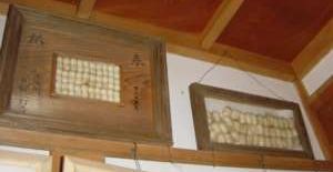 市内では、下溝地区の下溝八幡宮の境内にも木造の不動明王坐像(市指定有形文化財で江戸時代中期の作)があります。こちらも江戸時代には八幡社の別当寺であった大光寺の本尊であったものが、明治初期に神社と寺院の管理を神職と僧侶というように厳密に分ける神仏分離が行われた結果、大光院が廃寺となって不動像が下溝八幡宮の境内に祀られるようになったものです。このように、地域の神社に仏像が残されていることから「神仏混淆」(神仏習合)や別当寺、神仏分離といった日本全体の大きな歴史の流れを知ることができるのですが、そうした観点から改めて身の回りのことを見ていくと、さまざまな地域の歴史や文化が顔を出しているのに気が付きます。 なお、不動堂の中にはいくつかの棟札や絵馬のほかに、蚕の繭を詰めた額が2点あることにも注目されます。明治40年(1907)及び大正6年(1917)にいずれも地元の家から奉納されたもので、繭が三段ずつガラス入りの額の中に並べられており、後者に「9月吉日」とあることから繭がよくできたことを祝って奉納されたものと思われます。不動が火難除けのみならず養蚕に対しても信仰があったことを示す一方で、このような繭額というようなものは市内では他にほとんど例がなく、養蚕が非常に盛んだったこの地域にとって非常に重要な資料と言うことができます(民俗担当 加藤隆志)。