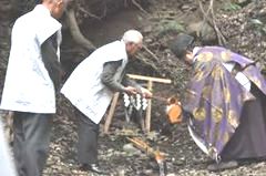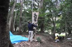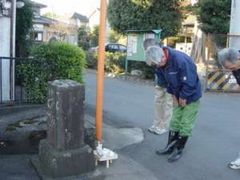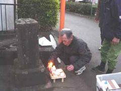 その後、午前11時30分頃から行われたのが道祖神の幟立てです。この地区では、現在行事を行っている場所から200mほど離れた、集落が並んだ四つ角の場所に道祖神などの石碑がありますが、そこに「奉納道祖神 明治二十二年一月十四日 上講中」と記された幟を自治会長が中心になって立てました。市域各地で盛んに行われているどんど焼きのなかでも道祖神の幟がある地区は今のところ他には確認できず、大変珍しいものということができます。この幟は翌日のどんど焼きの終了後に片付けます。そして、午後5時からは道祖神の石碑に灯明やお神酒などを上げて、自治会長と荒井耕地西自治会の代表の方々が拝礼し、12日の準備は終了しました。