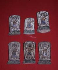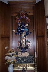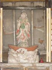 | 〜南区磯部・勝源寺の六本庚申〜(平成24年6月) 南区磯部の勝坂集落の中ほどにある勝源寺(しょうげんじ)は、千手観音をご本尊とする曹洞宗の寺院です。そして、本堂の一角に本尊とともにお祀りされているのが、今回紹介する青面金剛(しょうめんこんごう)像で、第二次世界大戦前の養蚕が盛んだった時期には、手が六本あるため六本庚申(こんしん)あるいは千体庚申と呼ばれ、養蚕に効験のある仏様として市内ばかりか広範囲からの信仰を集めていたことが知られています。 この像を祀る縁日は4月の初申の日あたりで、養蚕を行う多くの人がお参りに訪れました。この時には多くの露店も出て賑やかで、露店では木の枝に丸や繭の形をしたものや小判などを付けたお宝というものを売っており、それを買っていくと蚕が当たると言われました。また、本堂にはお姿をかたどった焼き物のミニチュアが1000個もあり、これを縁日にお参りに来た者が借りていき、養蚕の期間中は家で祀って秋に養蚕が終了すると返しに来ました。このミニチュアのお姿は、関東大震災の時に棚から落ちて多くが割れてしまったものの、今でもわずかにごく一部が残されています。