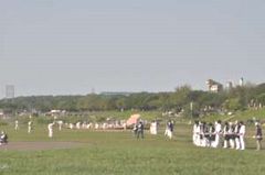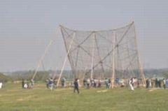 新磯地区の大凧は江戸時代の後半には行われていたとも言われ、現在見るような大凧が本格的に揚げられるようになったのは明治中頃からとされています。新戸では、日清戦争の戦勝祈願か凱旋記念で揚げた凧が最初の大凧と言われ、もともと5月のお節供に各家で凧を揚げ、特に男の子が生まれた初節供には一間ほどの大きさの凧を揚げていたのが、次第に大型化して地域全体で行うものとなりました。 大凧に記された題字は昔から漢字二文字で、今年は“潤水都市さがみはら”になぞらえて「潤風」でしたが、これは昨年に東日本大地震が起こって大凧まつりが中止になってしまったために、昨年選ばれていた「潤風」が改めて用いられました。今年は4日の日は午後から雨が降るなど天候に恵まれなかったものの、幸いにも5日は天気も回復して気持ち良い風が吹くなど、絶好の大凧揚げ日和となり、一番大きな新戸の八間凧も揚がって勇壮な姿を見せました。関心のある方は是非、大凧まつりに足をお運びください。5月の気持ちの良い風の中、地域の伝統や関連して行われる各種のイベントに触れることができると思います(民俗担当 加藤隆志)。 *ここに掲載したのは、博物館の民俗調査会でボランティアとして活動している市民の方から提供していただいた新戸地区の大凧揚げの写真です。これからも市民の方が撮影したさまざまな行事等の写真を紹介していきたいと思います。