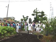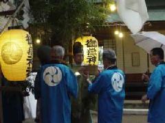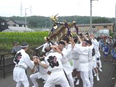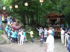 | 南区下溝の古山集落は下溝地区のもっとも北側にあり、集落の神社として十二天神社を祀っています。この十二天神社の祭礼が、今年(平成24年)は7月21日(宵宮)と22日(本宮)に行われ、集落の中を大人の御輿と子ども御輿2基、囃子連を乗せた屋台(山車)が巡行しました。この御輿は天保10年(1839)製で市内に残る御輿でも古いものの一つとされ、屋台も古くは慶応年間(1865〜1868)に上溝で再造したものでしたが、現在は新しく作り直したものを使っています。 この地域の伝承を調べた『古山の集落と土地利用』(相模原市教育委員会が刊行した)によると、かつては古山の中には十二天神社のほかに八坂神社と日枝神社があり、それぞれ3月(十二天神社)・7月(八坂神社)・9月(日枝神社)というように年に三回の祭礼を行っていました。それが明治30年(1897)に、八坂神社と日枝神社が十二天神社に合祀されて祠がなくなり、その後も二社の祭りはあったようですが、昭和に入ると三社合わせて7月に祭りをすることになりました。このように本来の十二天神社の祭日ではなく、地域の神社の祭礼として合祀された八坂神社の祭礼日の方を行うようになったのは、やはり御輿や屋台を出す華やかなオテンノウサマの祭りの魅力が強かったと考えられます。 また、以前は古山は集落の内が丸(マル)・上(カミ)・下(シモ)というように三つに大きく分かれ、例えば葬式があった際にはそれぞれの中で手伝い合ったりしており、祭礼の御輿も丸と上から7名、下から7名が出て(実際に担ぐのは12名で残りの2人は御輿を乗せる台を担ぐ)、これ以外の人は手出しをしたり途中で替わってはいけないなど、厳しい決まりがありました(現在ではこうしたことはもちろんありません)。一度担ぐと集落のもっとも下側の家に行くまで御輿から肩を抜いてはいけないということで、途中出される酒も担いだまま飲んだとか、御輿が重くて肩の皮が剥けているため翌日にうっかり鍬を担いだりするとあまりの痛さに鍬を畑に投げ出すほどだったなど、祭りに関するさまざまな話が残されています。 今年(2012年)の本宮は、22日の午後1時から式典を行い、2時から御輿と屋台の氏子回りとなりました。鎮守の森に抱かれた神社の正面から御輿が出て行く様子は見ごたえがあり、その後を子どもが一生懸命に小さな御輿を担いでいきます。御輿を担いでいる時や休んでいる間も絶えずお囃子が奏でられ、祭りの雰囲気を一層高めます。古山の囃子は上手で、当麻や上溝などに教えに行ったとも言われています。