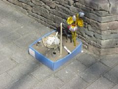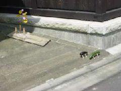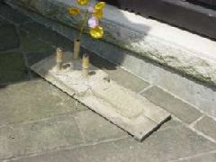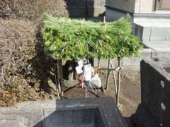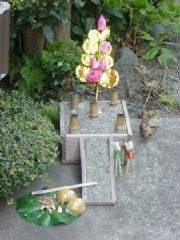 | 8月を代表する年中行事と言えばやはりお盆を挙げることができます。古くからの行事が廃れていく中、盆行事は正月行事と並んで簡略化されながらも今でも続けられていることが多いものの一つです。 ところで、神奈川県の盆を代表する行事としてよく紹介されるものに「盆の砂盛り」があります。県内の各地では、スナモリとかツカ・ツジなどと言って、盆の入りの13日に屋敷の入口や屋敷前の道端に土や砂を盛り上げて土壇を作り、中には何かが登るためなのか階段を付けたりすることもあります。そして、この砂などを盛ったところに線香を立てて造花などの花をさし、その脇で迎え火や送り火を焚きます。砂盛りは、静岡県や多摩地方にも見られるとも言われますが他県ではほとんどないとされており、その意味で神奈川県を代表する民俗として捉えられています。 しかし、この砂盛りはもう一つの重要な特徴があります。それは、砂盛りを作る地域は県内では東西に帯状に広がっていることが分かっており、三浦半島では希薄であり、相模原市でも緑区や中央区ではほとんど作られていないということです。この点を『相模原市史・民俗編』によって確認すると、市域での名称は一般に「線香立て」と呼ばれており、地域としては下溝・当麻・磯部・新戸・上鶴間にあり、特に磯部や新戸には色濃く見られます。また、例えば下溝では、大下集落では作るものの古山集落では行わないというように地区内すべてにあるわけではなく、当麻や上鶴間も同様の傾向があります。中央区になりますが上溝や田名では、やっていた家もある一方で一般的ではなかったとのことです。つまり、県内を帯状に分布するこの砂盛りは市内でも南部地域では作られ、特に新磯地区に顕著というように地域差が顕著な民俗であるということができます。 今年の8月17日にこうした地域の一部を回ってみたところ、さすがに現在では土や砂を固めて作ったのは少なく、鉢や缶・箱に砂などを詰めて線香立てとしているものが多くありました。また、中には石製で盆のたびに出してそのまま使っていると思われるものがあったり、階段付きも確認できました。ちょうど送り火の翌日でしたので隣りには送り火を焚いた跡があり、砂盛りとその近くには、線香を立てる竹筒や盆棚に供えてあった造花やナスとキュウリの馬、アライアゲといって刻んだナスとインゲンに洗った米を混ぜて里芋の葉に載せたもの、アライアゲに水をふりかけるのに使うミソハギ、オガラ(麻幹)などが置かれていました。