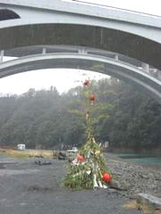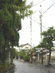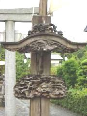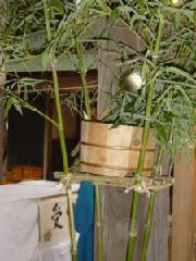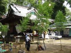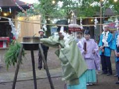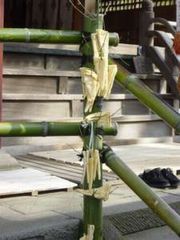 | 境川近くの地区の神社の多くは川沿いに見られ、中央区上矢部地区の鎮守である御嶽神社も同様に常矢橋のすぐ西側に鎮座しています。御嶽神社の例祭は日取りがいくつか動いた後に現在は9月の第一土曜日となり、この日には相模原地域ではここだけである湯花(ゆばな)神事が行われています。 湯花神事には境内の社殿の前に笹竹を四方に立てて注連縄を張り、その中央に三本の丸太を組んで大釜を据えます。また、地元でカツンボと呼ばれるニワトコの木を13本編んで棚を作り、この棚は社殿の向かって右側にある柱に設けて桶を乗せておきます。かつては川原にあったカツンボは無くなってしまい、最近では参道の脇のところに植えたりしているそうです。