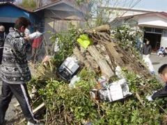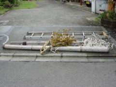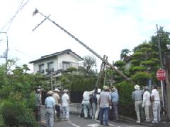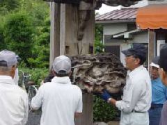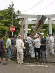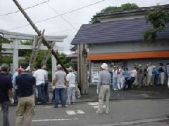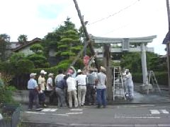 私が訪れたのは幟を片付ける幟返しが行われた2日で、作業が開始される午前8時30分には40名ほどの男性が集まり、挨拶と清めの酒を飲んでから幟返しが始まりました。当社の幟には、両方ともに幟枠という龍が彫られた立派な木製の彫り物(ちなみに片方は10年近く前に盗難にあい、残った方を見本に作り直したということです)が取り付けられており、まずこれを外します。そして、「鎮守 御嶽神社 昭和五十八年九月一日 氏子中」と書かれた幟を下げて竿から取り、幟枠の上部の飾りを外していよいよ竿を倒し始めます。幟竿はかつてはもっと大きかったようですが、現在の一回り小さくしたものでも10mほどの長さはあるとのことで、倒す方向とは反対側では急に落ちたりしないように縄で引っ張り、梯子で枠を支えながらゆっくり倒していきました。そして、約1時間で二本の幟を片付けることができました。ちなみに幟立ては梯子で支えながらなのでもっと大変で、約2時間ほど掛かったそうです。 最初にも記したように、祭りに当たって氏子が寄り集まって人力で大きな幟を立てることは古い形式を残しており、また、大勢の氏子の方が集まることは、地域の祭りの一環として意味あるものとして位置付けられていることが分かります。それでも実際に仕事に当たられる立場からは、作業が大変なこともあって常設のポールを設置する意見も出されているとのことで、今後の推移を見守っていきたいと思います(民俗担当 加藤隆志)。