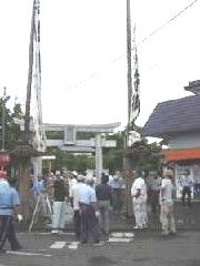 | 7月の天王祭から引き続き、8月から9月にかけては各神社で祭りが行われます。こうした祭りに行くとまず目に付くのが、鳥居の両脇に建てられた幟(のぼり)です。幟は大きなものや小ぶりなものもありますが、神社が祭りであることを周囲に示す重要なしるしとなっています。 幟は、元々は神を招いたり神が訪れたことを表した旗飾りで、「依代(よりしろ)」と考えられています。古くの日本の神は社殿に常在するのではなくて祭りの時に迎えるものであり、そのために神が降臨するためのものが必要で、それは天然の樹木や岩・山のほか幟などの柱を立てることもあります。幟の先に榊などの葉を付けるのは単なる飾りではなく、神を迎える装置としての意味があったとされています(『日本民俗大辞典』)。