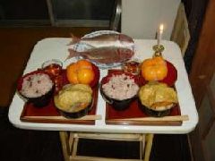 | エビス講は、各家での年中行事の中でも大いに行われていた行事の一つで、『相模原市史民俗編』や『相模湖町史民俗編』などをはじめ、これまでにも市内各地からの多数の報告があります。エビス講は、福の神であるエビス・大黒にいろいろなお供え物をして祀る行事で、基本的に一年に2回、正月と秋(10月か11月)に行われます。特に商家のほか、農家でも盛んに行われていました。この行事もほかのものと同様に近年ではあまり見られなくなっていますが、「民俗の窓」に何回も登場いただいている、緑区根小屋の菊地原稔さんの家では現在でも行っているということで、写真を撮らせていただきました。