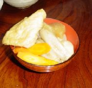 当家では御当主の祖母に当たる方がこうした信仰に熱心で、例えば、路傍の道祖神などの石仏に納められている(どんど焼きで燃やすためにおいてある)エビスや大黒像を貰い受けて来て、酒を供えて「この家のために働いてください」と言ってお祀りしました。ちなみに祖母は御札や達磨などもどんど焼きで毎年焼くのではなく、「御札が千枚集まれば長者になる」として保管していて、今も御札などはたくさん残されているとのことです。 この棚の下側にテーブルを置き、灯明と魚、膳をエビスと大黒の分として二膳お供えします。魚は鯛で、皿に腹合わせに載せます。ただし、昔は鯛などはなかなか買えなかったため、鯵が多くてサンマだったこともありました。膳には箸のほか、お神酒、小豆飯、柿、野菜の煮物を付け、小豆飯はうるち米を焚いたもので、エビス講の時にはもち米を蒸かした赤飯は使いません。柿は「掻き取る」ということで供えますが、あまり他の家で供えているのを見たことはなく、野菜の煮物は大根・ニンジン・ゴボウ・里芋を煮て、その上には油揚げが一枚載せられていて、これは根小屋辺りではよく作られているそうです。このお供え物は当日はそのまま置き、翌日の朝に下げて食べることになります。なお、エビス・大黒がお金を稼いできたためエビス講には財布や金を一升枡などに入れてお供えするという話もあるものの、当家では金を上げると働かなくなるといってやりませんでした。