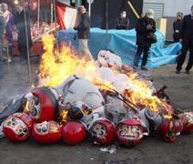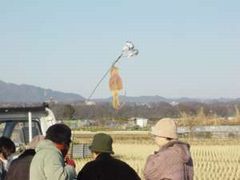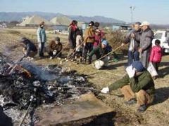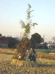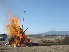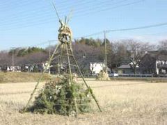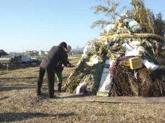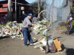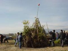 | この冬も団子焼き・どんど焼きの時期がやってきました。今年は成人の日と日曜日の関係で12日(土)から14日(祝)までに行われた地区がほとんどで、昨年に比べて短期集中となりました。例年通り、いくつかの地区を回らせていただきましたが、まず南区新戸の上地区のどんど焼きについて紹介します。 南区新戸は市内でもっとも南西部にあり、水田に乏しい市域の中でも相模川に面した比較的田の多い所です。今回取り上げるのは新戸の北側にあたる、荒井耕地西・荒井耕地東・上新・中央・新道の五つの自治会が合同で行っているどんど焼きで、毎年五つの自治会が順番に準備などに当たることになっており、今年は荒井耕地西自治会が担当しました。