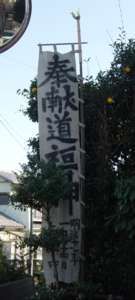 | 〜南区相模大野・蚕守稲荷神社の大題目〜(平成24年4月) 小田急線相模大野駅そばの、行幸道路と国道16号線の陸橋が交わる所の角に小さな鳥居が見える神社は蚕守(かいこもり)稲荷神社で、上鶴間の谷口集落の中の山野講中の家々によって祀られています。この稲荷には、嘉永7年(1854)に京都の伏見稲荷神社から出された古文書が残されており、文書には「正一位蚕守稲荷」とあることから(「蚕守」の文字は右横に書き添えられています)、この時期にはその名の通り、養蚕の神として祀られていたとも考えられています。祭礼は、2月初午、4月17日の大題目(おおだいもく)、7月24日の御命日(ごめいにち)の三回で、このうち特に春の養蚕が始まる前に行われる大題目には、豊繭を願って近隣から大変多くの参詣者がありました。