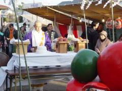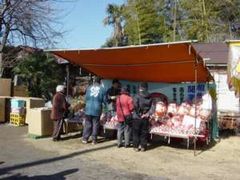 | 中央区上溝3〜7丁目付近の県道に沿った地域は、かつて市場が開かれていた場所です。上溝市場は主に生糸や繭などの取引を目的として明治3年(1870)に開設され、毎月6回、3と7の付く日に開かれた六斎市(ろくさいいち)です。市日(いちび)には糸や繭を買う商人などをはじめとして多くの商人が集まり、露天も出て大変に賑やかだったと言います。また、多くの商店も立ち並び、相模原の中心的な商業地となっていました。 この地で今年の1月13日(日)に行われたのが「だるま市」です。元々、上溝にもだるまを作る職人がいて1950年代の前半までだるま市が行われていましたが、その後は職人がいなくなったこともあって行われなくなりました。それを平成元年(1989)に復活させたのが現在のだるま市で、7月の夏祭り(上溝の天王祭)と11月の酉の市とともに上溝の三大イベントを構成するうちの一つとなっています。ちなみに今は相州だるまが売られています。