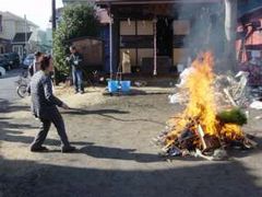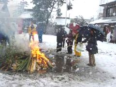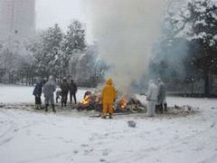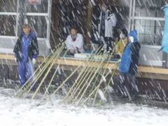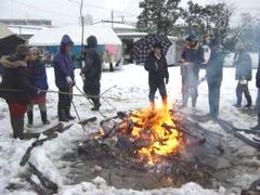 | 今年のどんど焼き・団子焼きは12日〜14日にかけて市内の各地を回りましたが、12・13日は火に当たっていると汗ばむほどの陽気で、大変和やかに行われました。ところが14日は一転して数年ぶりの大雪となり、特に午後からは短時間に雪が降り積もりました。この日は事前のニュースでも大雪の予報が出されており、調査も若干の躊躇がありました。それでも少し回ってみて、中止や延期の場所が多ければそこで終わりとの心積もりで行ったところ、予想よりも多くの場所で行われていたのに出会いました(もちろん翌日などに延期となった所も確認しました)。 実施していた地区で「この天気の中、大変ですね」と声を掛けたところ、すべての所で「これは14日にやることになっているので仕方がないですね」とのご返事をいただきました。改めて、昔からやっている行事の意義について考えさせられるきっかけとなりました。写真の1〜3は平成25年1月12日、4〜13は1月14日の様子を紹介しています。なお、14日は、民俗調査会の五十嵐昭さんと千葉宗嗣さんに同行していただきました(民俗担当 加藤隆志)。