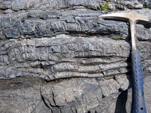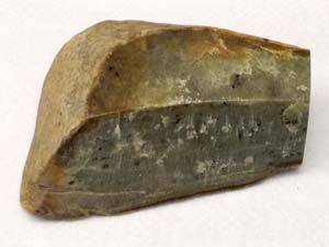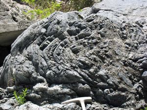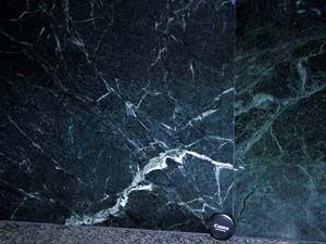| 山梨県大月市笹子町には、地球内部のマントルを構成している岩石がみられます。ただし、マントルを構成する岩石が直接露出しているわけではありません。ここで見られるのは、蛇紋岩(じゃもんがん)で、マントルを構成しているカンラン岩が変質したものです。蛇紋岩は、黒色や濃い緑色をしており、独特の光沢を持つことが特徴です。ビルの壁などの石材にも利用されています。
