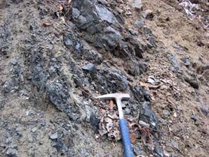 大月市の蛇紋岩は、分布が数メートルと非常に狭く、周囲の岩石に挟み込まれるように分布しています。また、現在では植生や上から崩れてきた土砂などに覆われており、見つけるのにかなり苦労しました。この蛇紋岩の周囲の岩石は、相模湖層群瀬戸層 (さがみこそうぐんせとそう)の約3,000万年前の泥岩や砂岩です。地表近くで形成された泥岩や砂岩の中に、なぜ、地下深部を構成していた岩石が挟み込まれるようになったのかは、明らかになっていません。