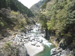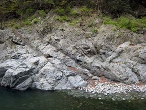 これらのチャートや砂岩はもともと現在見られる場所でできたのではありません。陸地から離れた海底や海溝で堆積したものが移動する海洋プレートに乗って運ばれてきて、さらに地殻変動により陸上に露出したものです。海洋プレートは、ちょうどベルトコンベアーのように、上に乗せたものを陸の方まで運ぶ役割をしています。このように、プレートによって運ばれて陸地の一部となった地層・岩石の集まりを付加体(ふかたい)と呼んでいます。鳩ノ巣渓谷や御岳渓谷はプレート運動の証拠を陸上で見られることができる場所の一つです。(地質担当:河尻清和)