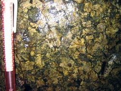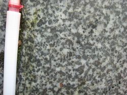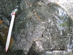 丹沢山地の中心部をつくっている岩石は、閃緑岩や斑れい岩のなかまです。閃緑岩や斑れい岩は、マグマが地下深くで、ゆっくり冷えて固まってできた岩石、いわゆる御影石と呼ばれているものの一種です。含まれている鉱物がかなり大粒の斑れい岩もみられます。